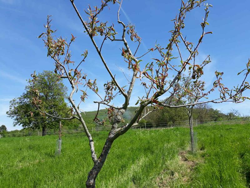 Gelber Rheinsteig Pfirsich, der Baum hat aber auch Stellen mit Totalbefall!! Am Standort gibt es eigentlich immer etwas Wind, Osthang