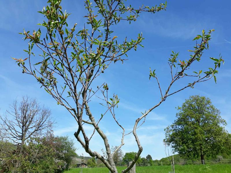 Ohne Spritzung hat mein 9 Jahre alter Weinbergpfirsich einerseits etwas Monilia, wenig bis mittel Ertrag und 100 % Kräusel. Der Baum ist deshalb rotblättrig. Mal sehen was davon übrigbleibt.