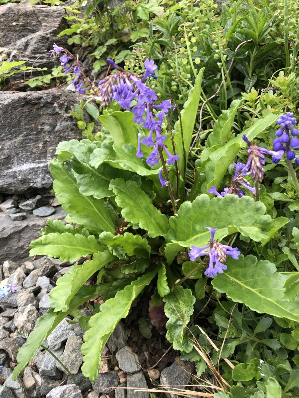 Diese Kombination von Ornithogalum nutans und Traubenhyazinthen gefiel mehr sehr gut auf einem Dorfplatz. Die Tulpenblätter lassen ahnen, dass früher dort einmal ein Haus mit Garten gestanden haben muss.