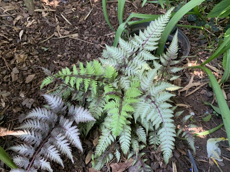 Ich kann meine diversen Athyrium niponicum auch immer weniger auseinanderhalten. Theoretisch müsste ich ‚Silver Falls’, ‚Ursula’s Red’, ‚Red Beauty’ und ‚Metallicum’ haben. Zunächst kamen sie mir auch schon unterschiedlich vor, was rückblickend aber offenbar eher am Standort gelegen hat, denn nachdem ich mehrere unter identischen Bedingungen im gleichen Beet hatte, verloren sich die Unterschiede fast völlig, sie sind praktisch kaum noch auseinanderzuhalten - beinahe vermute ich, die Sorten sind Willkür und die Färbung hängt letztendlich mehr von Licht und Schatten ab als alles andere. Meine sind alle von Kirschenlohr und Junge/Danielsen, also eigentlich aus zuverlässigen Quellen… trotzdem. Ganz ehrlich, selbst die Beschreibungen und Fotos der unterschiedlichen Sorten sind auf der Website von Kirschenlohr nicht wirklich überzeugend… das hört sich teilweise identisch an und sieht auch so aus. Dieser hier (angeblich Ursulas Red) treibt in diesem Jahr gleich dreifarbig aus. Obwohl es tatsächlich nur eine einzige Pflanze ist, ein einziger Wurzelstock, sind die Wedel teils rot, teils grau, teils grün im Austrieb.