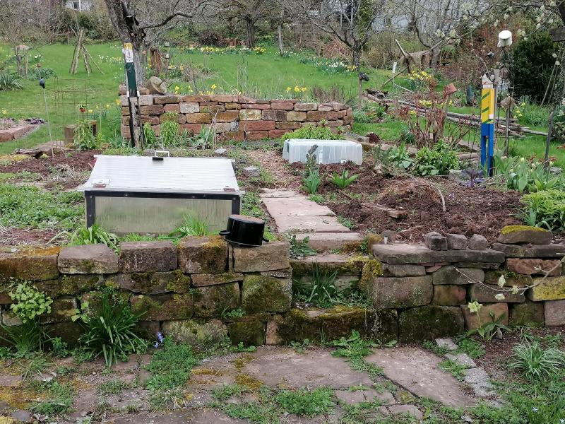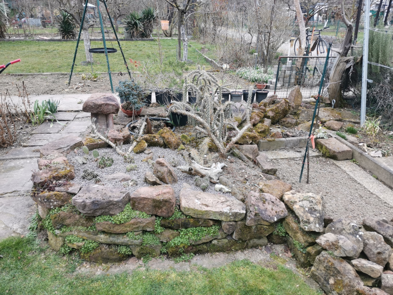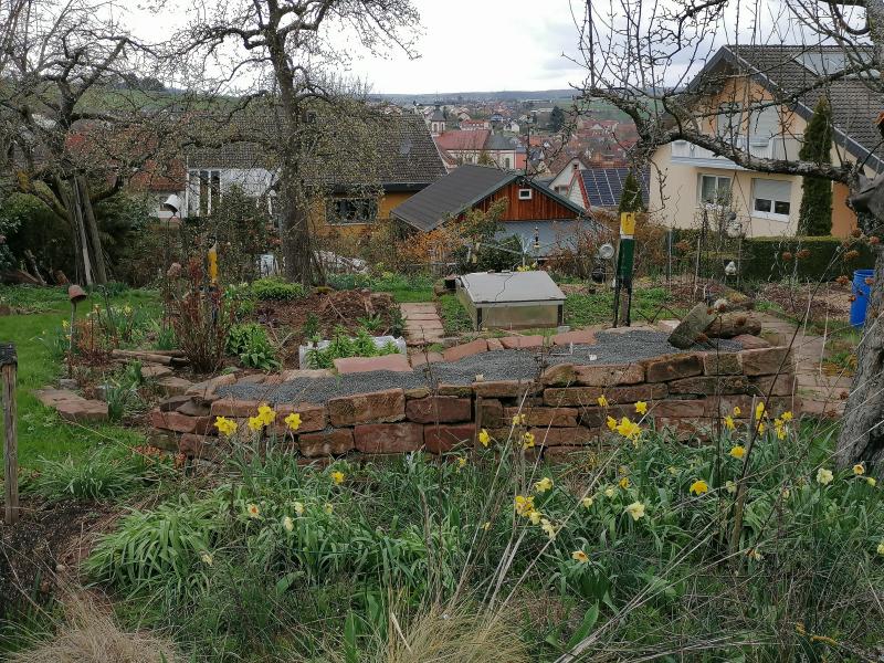 Bei mir pfeift der Wind durch, sowas fliegt mir gern mal weg. Darum auch die Mauer im Hintergrund. Sie hat eigentlich keinen richtigen Zweck, außer etwas Windschutz, und damit die Kaltluft hangabwärts nicht direkt in meinen Garten fließt, sowie als Wärmespeicher im Sommer.