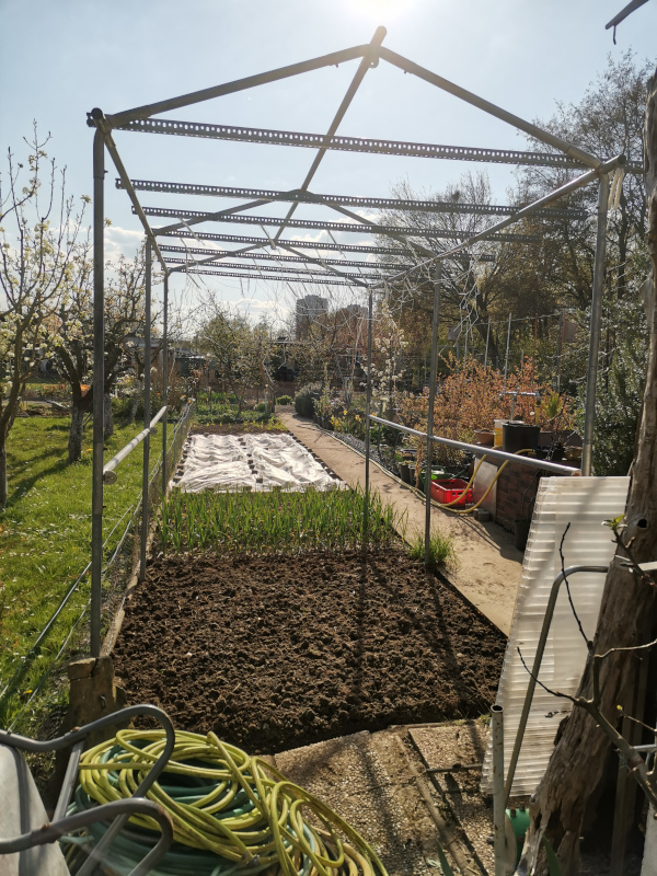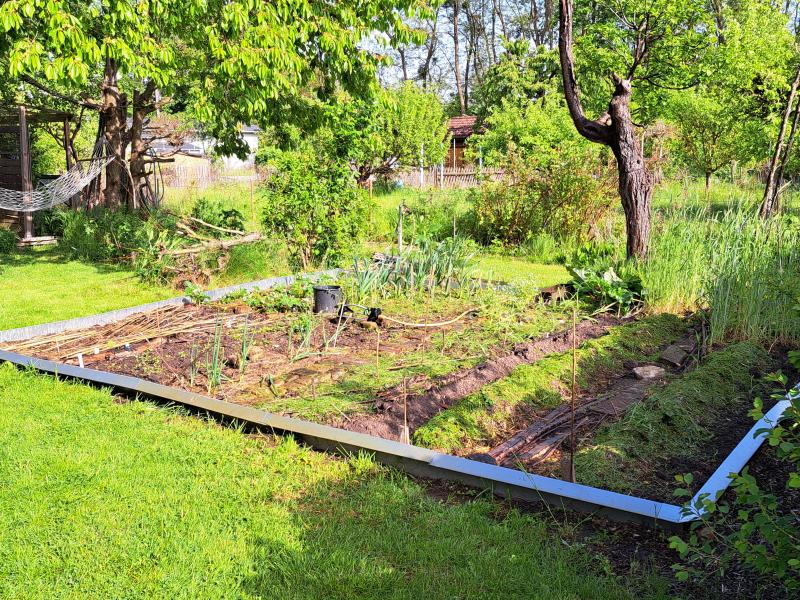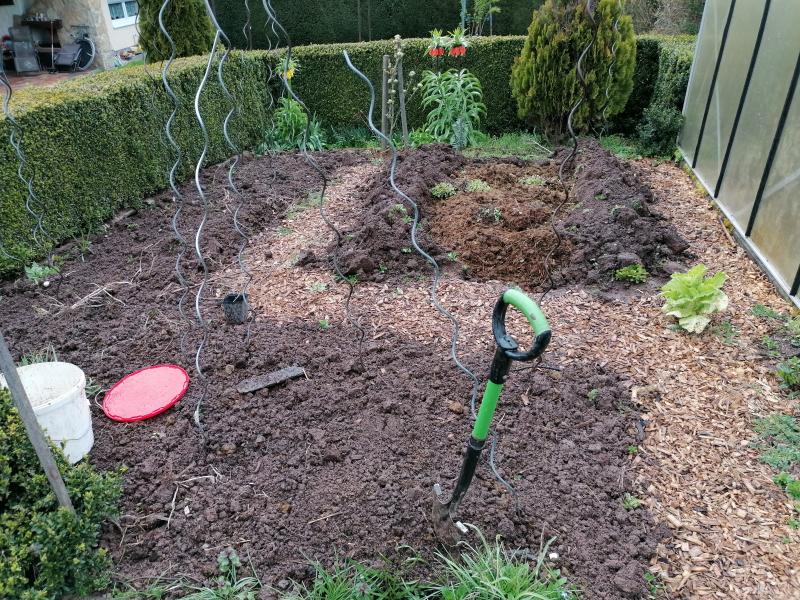 Ich habe die Tage noch das fast letzte Stück vom langen Beet pflanzfertig gemacht und das `Freilandhaus´ verrückt. Da waren vor ein paar Tagen noch ein paar Obstbäume, Stachelbeeren und Lauchzwiebeln, bald sollen Gurken und Melonen rein.