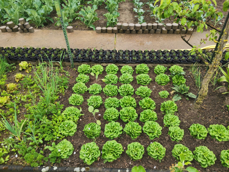 Die späteren Sätze brauchen noch. Die 2 Lücken, wo jetzt Blattkohl drin wächst, da waren die Köpfe gerade mal eine gute Handvoll, aber der Kohl muss eben jetzt rein.