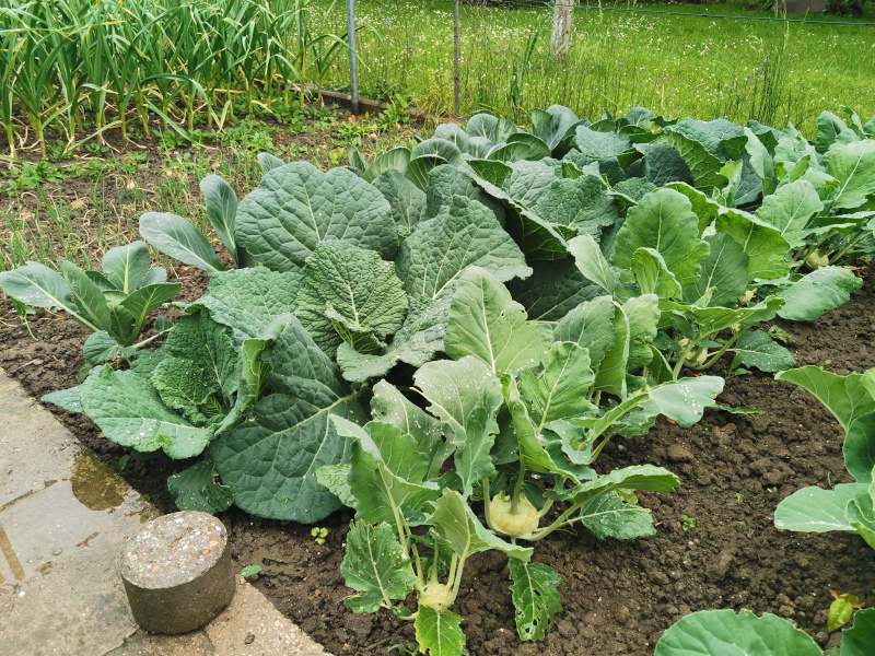 Der Kohl steht in diesem feuchten, kühlen Frühjahr ganz gut da. Es gab mal etwas Schwefelmangel, aber ansonsten geht es langsam, aber kontinuierlich voran.