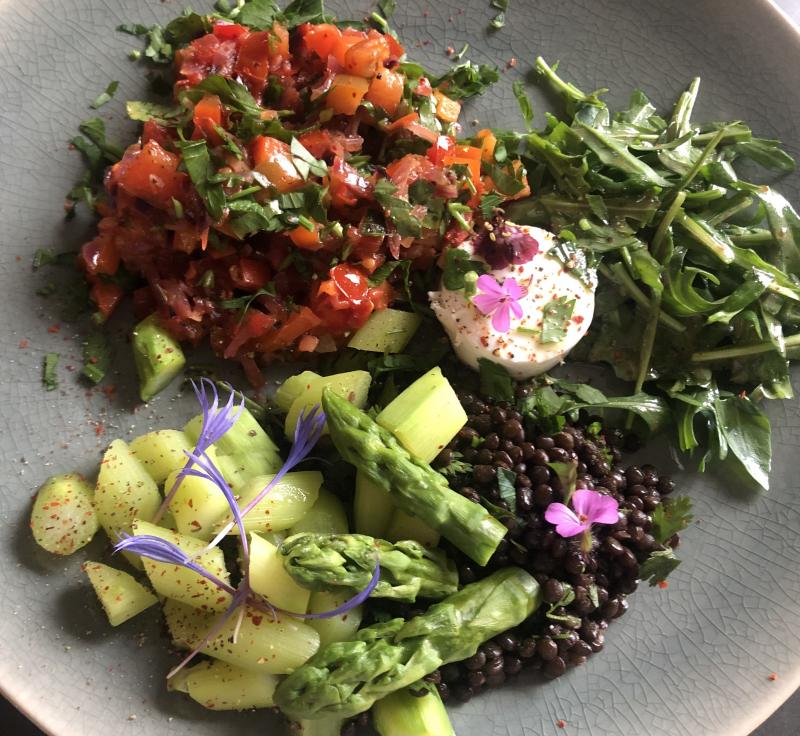 Zum grünen Spargel gab es heute Paprika-Tomaten-Gemüse mit Koriander, Belugalinsen mit Kürbiskernöl, Zitronensaft und Petersilie, etwas Rucola mit Vinaigrette und Ziegenfrischkäse.
