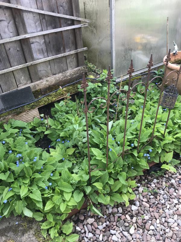 Es sieht alles ganz nach Kraut und Rüben aus. Eine mickernde 'Gloria Dei' und div. kleine Stauden, eingerahmt vom ausufernden Frühlings Gedenkemein (wer davon haben will - ich muss immer wieder eingreifen, denn es wuchert schon sehr. Kann also reichlich abgeben). Hinten steht noch eine Clematis 'mandshurica', die wundervolle weiße, kleine Blüten hat. Sie soll die Wand erobern.