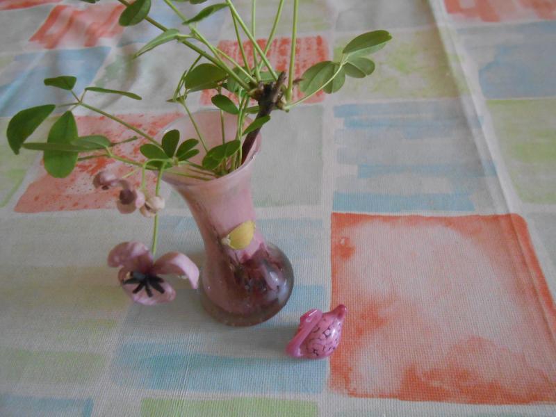 Heute habe ich aus Versehen einen kleinen Zweig mit Blüten von meiner Akebia abgerissen. Ich finde er passt gut in dieses Väschen.