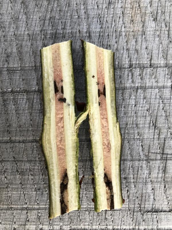 Typisch ist das sie auch im vollen Laub welk werden und Triebe absterben. Wenn man dann runterschneidet sieht man den hohlen Markkanal in dem die Raupe gefressen hat. Irgendwo unten sitzt dann die Raupe oder Puppe.