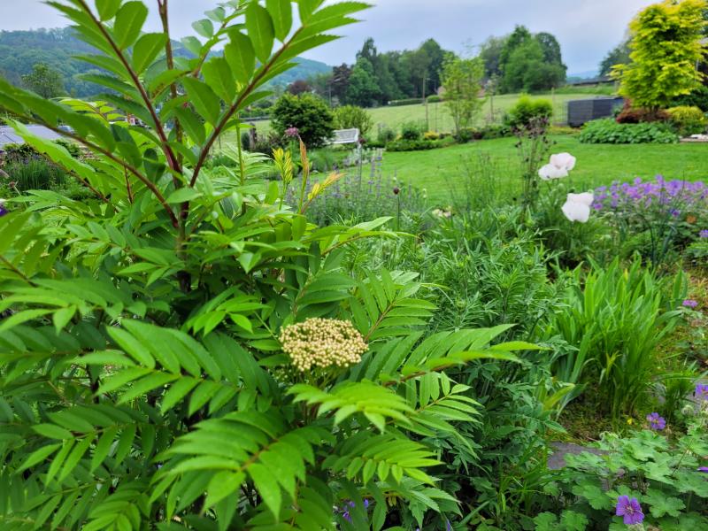 Diese Zeit jetzt Ende Mai liebe ich besonders. Wenn die bunten Farben des Frühlings verblassen und die sanfteren Töne zusammen mit grasigen, wiesigen Komponenten eine naturhafte Stimmung zaubern. Das ist hier noch vor der so sehnsüchtig erwarteten Paeonienblüte und bevor die prächtigen Rosenblüten und Hemerocallis wieder alle Blicke auf sich ziehen... ;)
