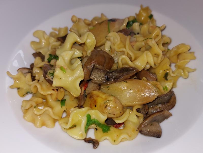 Gestern gab es unterwegs einen Bauernsalat und heute die Reste vom Samstag, aufgepeppt mit Rotkappen aus dem TK