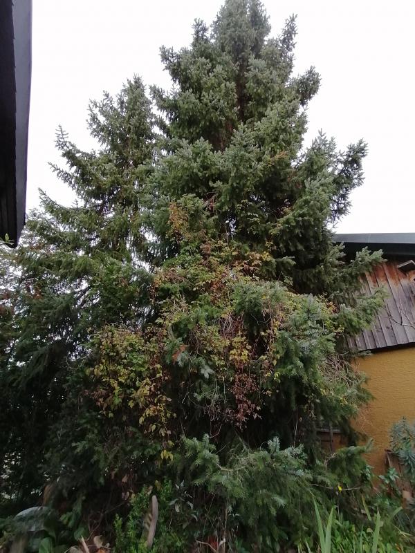 Die Stammstummel, naja. Spontan denke ich an Clematis viticella. Die ist da sowieso noch drinnen, die ging vorher schon jahrelang die Fichten hoch.