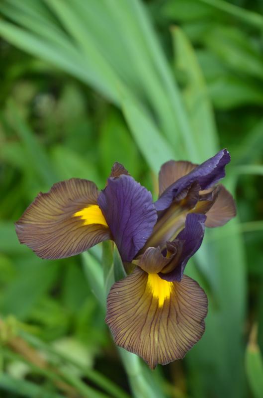 Versteckt im Laub die zarte Iris graminea. Mit dicker Hummel. :D