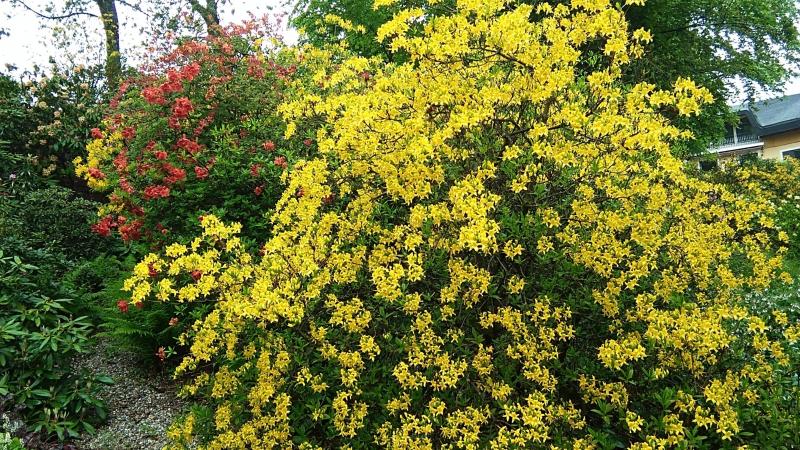 Hier blüht aktuell R. luteum 'Blaues Wunder'. Die Laubfärbung lässt sich mit der Kamera nicht so richtig einfangen.