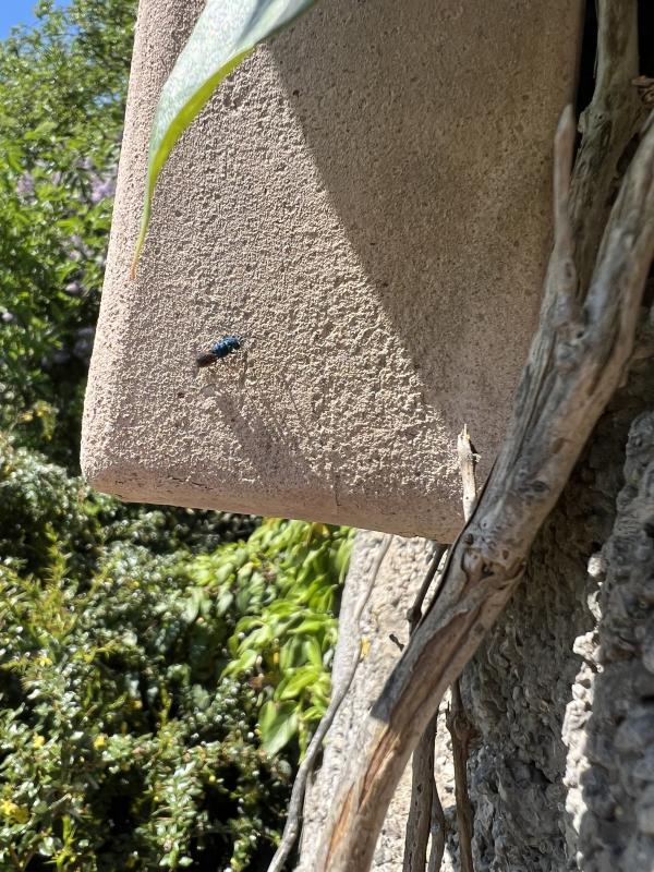 Das sollte eine Goldwespe sein Gartenplaner, ein Gegenspieler/Brutparasit bei Wildbienen und Solitärwespen ;).