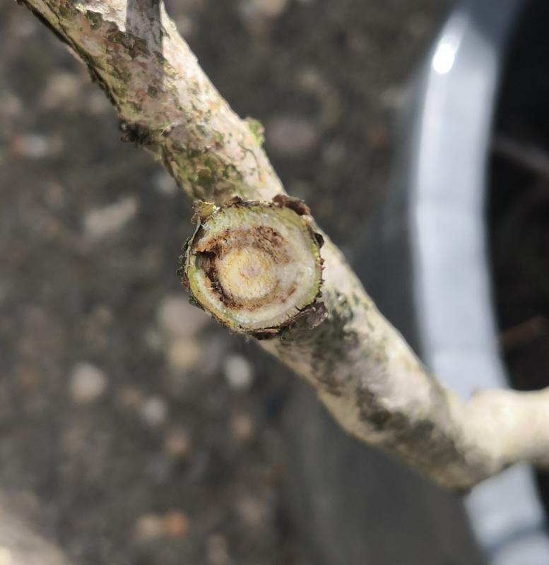 Beim Ahorn ist ein Ast total schlaff, beim Cercis habe ich in abgeschnittenen Ästen lauter dunkle Kringel.