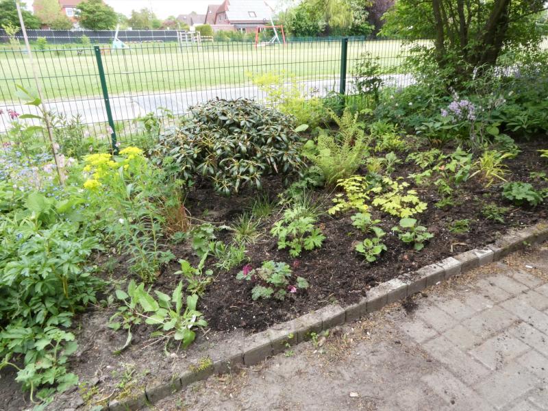 Rechts neben dem Rhododendron ist ein breiter Streifen, der schon fast ganztägig schattig ist und durch die Baggerarbeiten tiefgründig und wurzelfrei ist.