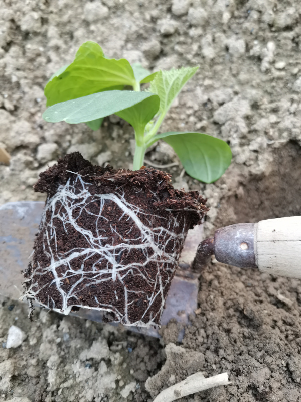 Das gekaufte oft schnell kaputt gehen, liegt nicht nur daran, das sie zu früh verkauft werden, sondern auch das sie zu verweichlicht angezogen werden. Bestes Stadium zum Pflanzen ist meiner Meinung nach mit anderthalb Blatt, wenn ein 9er Topf gerade durchwurzelt ist. So wie auf dem Bild. 22 Tage nach dem aussäen. 1 Korn pro Topf 2cm tief und im Keller unter LED bei 20°C, nach 18 Tagen in den Garten auf die Terrasse zum abhärten.