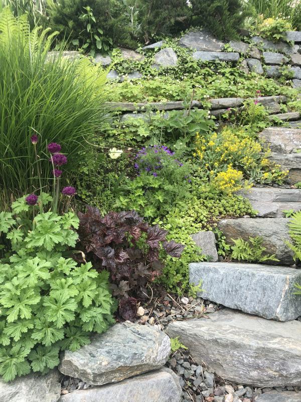 Staudo hatte mir mal gesagt (und gezeigt), dass die hohen Lauchsorten nicht in der Sonne stehen müssen, um Eindruck zu machen. Mitte Mai war hier immer eine Lücke, in der fast nur die Akeleien einen ernst zu nehmenden Blühaspekt gesetzt haben. (Bart-Iris stehen hier nur an wenigen Stellen.) Allium hollandicum 'Purple Sensation' und Allium stipitatum 'Everest', gefolgt von der niedrigen 'Ostara', sorgen seit ein paar Jahren für schöne Akzente in der schattigeren Mitte des Gartens.