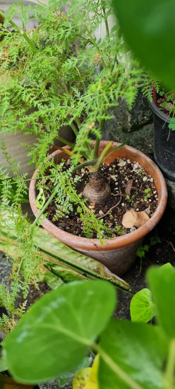 Monizia edulis macht gerade richtig Freude. Die Knolle wird langsam zum Stamm und sie schiebt ein Blatt nach dem anderen.