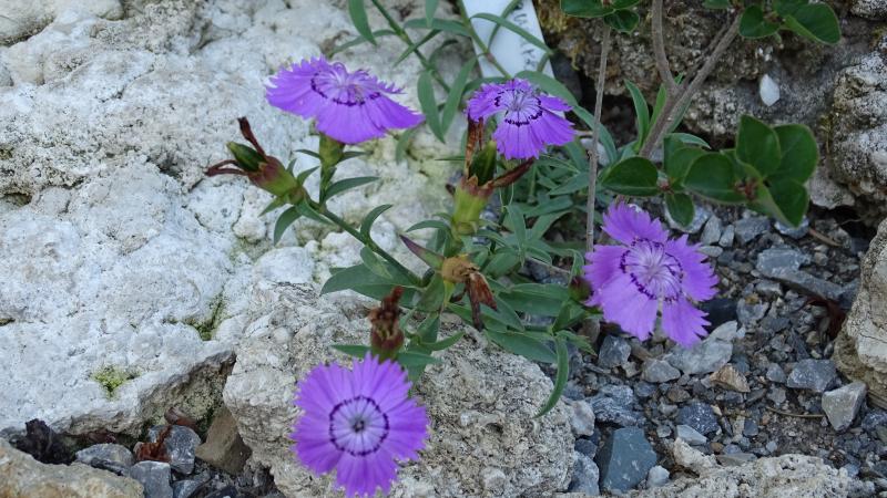 Hier blühen Dianthus gratianopolitanus (die Wildform) und Dianthus praecox aus der Slowakei.