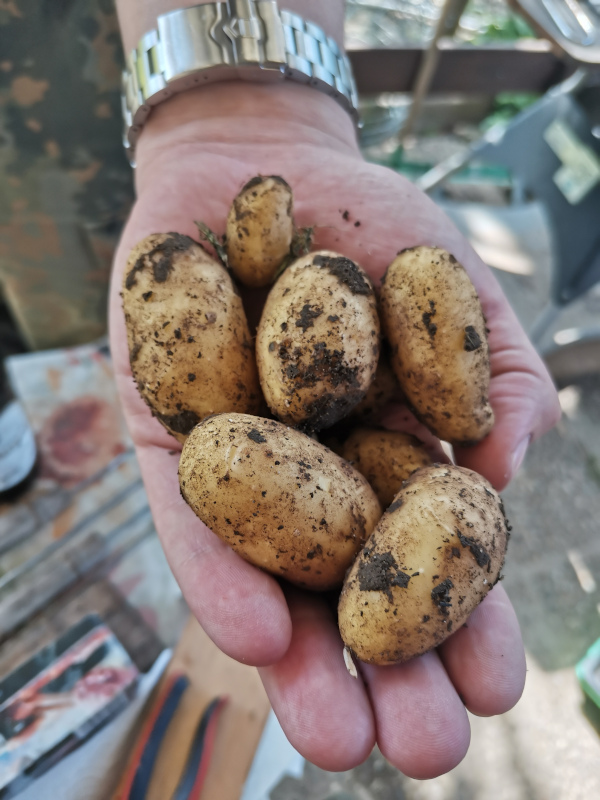 Vor 2 Tagen an Himmelfahrt wurden die ersten Kartoffeln geerntet, vergessen bei der Ernte 2022. Also außer Konkurrenz.