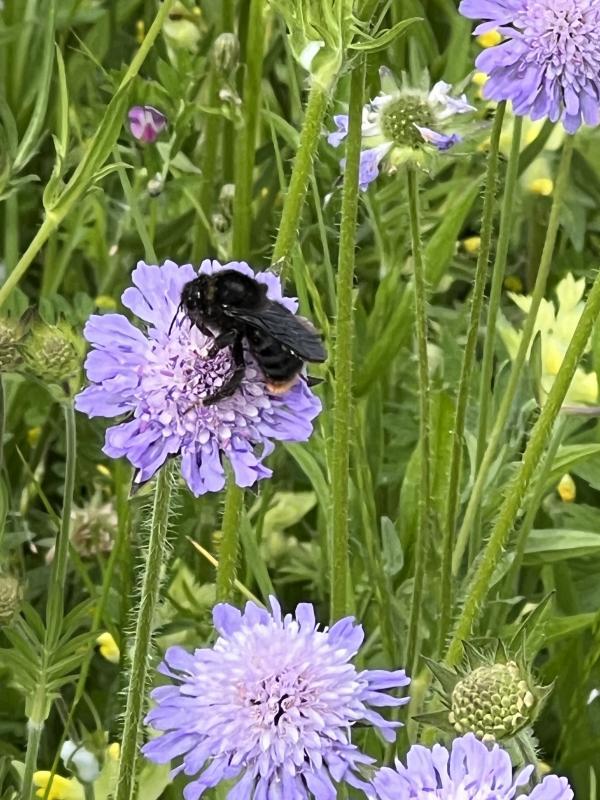 Die war größer als die größten Hummeln, die ich hier kenne, hatte ganz dunkle Flügel und flog von den Blüten mehrfach Richtung hintere Obstwiese und kehrte nach einer Weile zurück - ich hatte das weibliche Pendant zur Holzbiene vermutet, die Größe war gleich.