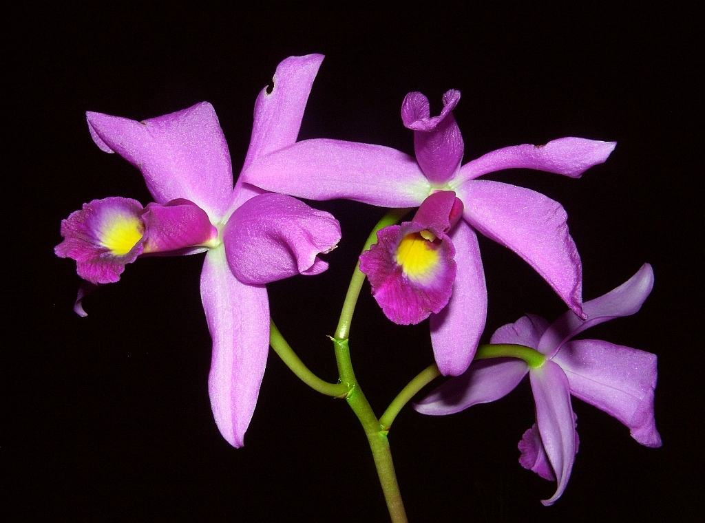 Von mir heute auch ein paar Bilder: zunächst einmal meine alte Cattleya-Hybride, die ich quasi namenlos (evlt. Cattleya lawrenceana x ?) schon seit Urzeiten habe und die jedes Jahr zuverlässig blüht.