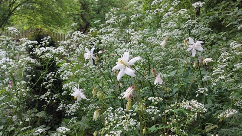 Im wilden Garten breitet sich Myrrhis odorata unter dem Nussbaum aus, das grüne Monster im Hintergrund ist Rosa helenae. ;D