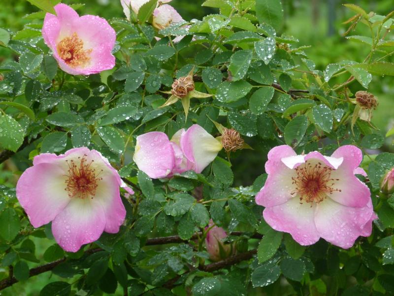 Seit etwa 8 Jahren habe ich "Frühlingsmorgen" mit hinreißenden einfachen großen Blüten und feinem Duft. Im Herbst gibt es auch vereinzelt Nachblüten.Leider ist der Strauch selbst sehr stakelig hochwachsend (ca. 2,20 m) und hat eine Tendenz zum Umkippen. Ich habe immer Stützstäbe daran und überlege, ob ich die Rose im Frühjahr herausnehmen soll, weil sie nichtblühend der hässlichste Rosenstrauch in meinem Garten ist - und dass immerhin mehr als 11 Monate im Jahr.