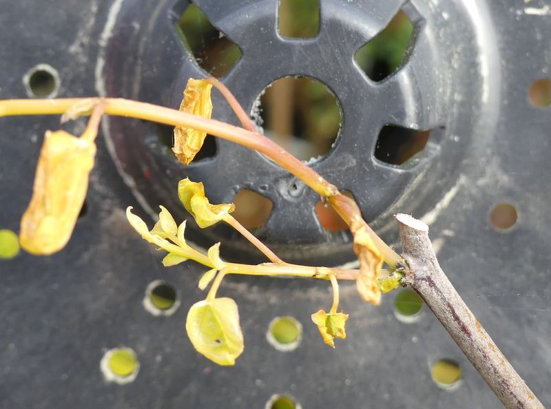 Mein Cercis Canadiens, im Topf, blieb stockend im Wachstum. Blätter weiterhin grün.