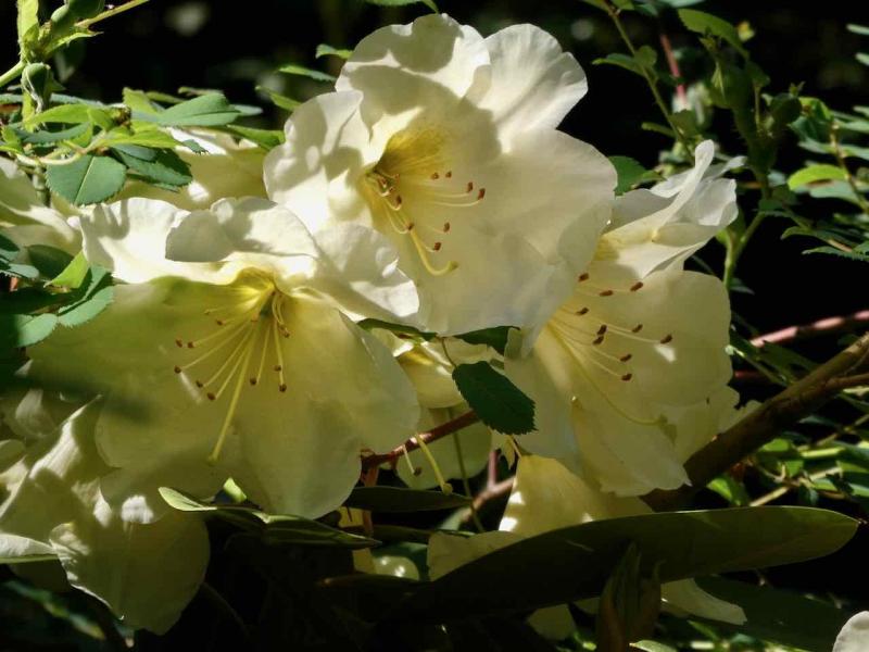 @ goworo: Die Pflanze ist erst seit diesen Frühjahr bei mir im Garten. Die Winterhärte wird wohl nicht der, der meisten Seidel-Sorten entsprechen. Das Laub scheint einige Blatt -Schäden davon getragen zu haben. Sie steht jetzt bei mir vor Mittagsonne ziemlich geschützt im Schatten einer Kiefer. Die R. falconeri – Abstammung ist (mit etwas Mühe) schon zu erkennen…