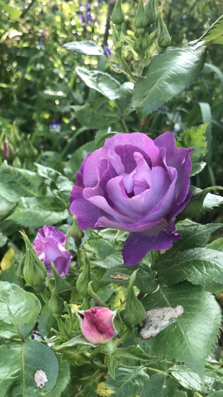 Bei York & Lancaster gefallen mir die Blütenfarben und die Geschichte. Der Wuchs ist nicht so prickelnd, sie wächst hoch, die untere Hälfte ist nackt. Die Triebe sind eher dünn und müssen festgebunden werden, der schattigere Platz zwischen anderen Rosen könnte das verstärken. Deshalb hatte ich nur das Blütenfoto gemacht. :-X