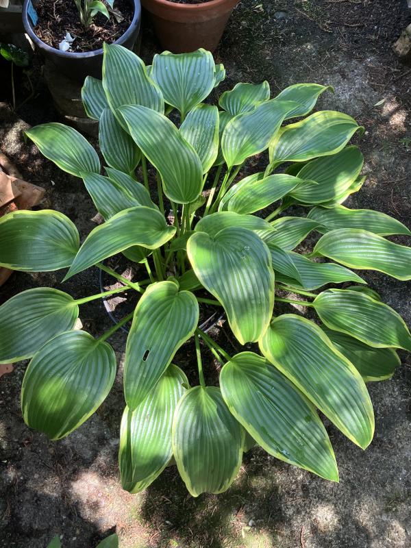 Hier müssten einige Hosta endlich mal umgetopft werden. 'Gilt by Association' sieht aber noch ganz gut aus. Die braucht eher mal einen höheren Kübel.