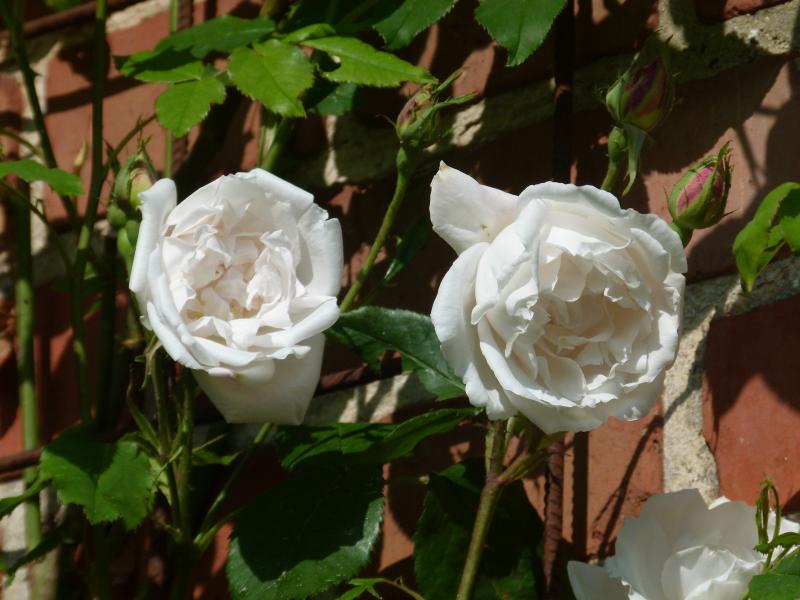 Bei York & Lancaster gefallen mir die Blütenfarben und die Geschichte. Der Wuchs ist nicht so prickelnd, sie wächst hoch, die untere Hälfte ist nackt. Die Triebe sind eher dünn und müssen festgebunden werden, der schattigere Platz zwischen anderen Rosen könnte das verstärken. Deshalb hatte ich nur das Blütenfoto gemacht. :-X