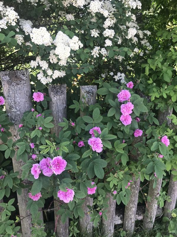 Hier wächst York & Lancaster etwas anders, eine Stütze braucht sie nicht. Sie steht allerdings sonnig. Insgesamt wächst sie aber auch hier im Vergleich zu anderen Damaszenern schwächer und der Strauch ist eher " luftig".