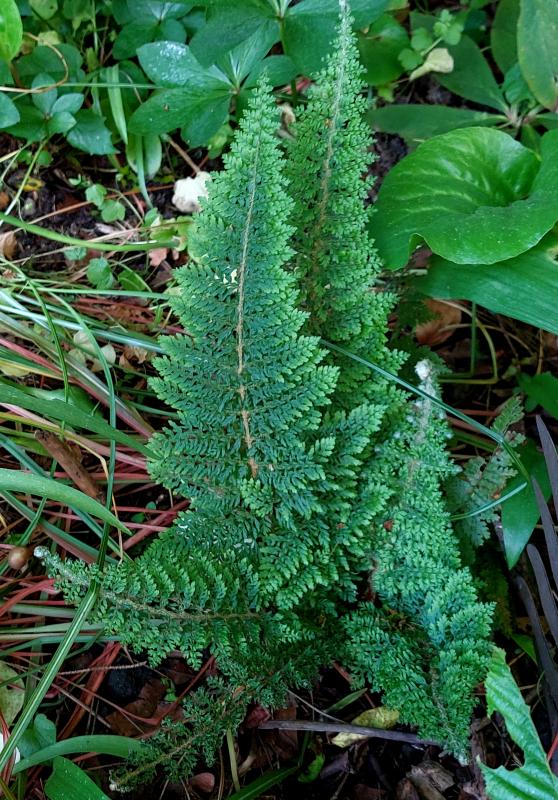 Dieses auch noch junge Exemplar eines Schildfarns ( Plumosum densum ) hatte im ersten Jahr ziemliche Anlaufschwierigkeiten - nur ein kleiner Wedel,
