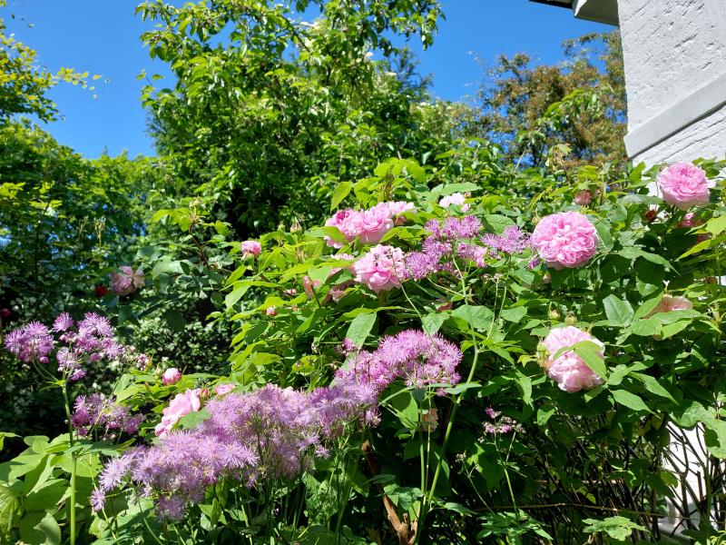 Rose Jacques Cartier, Wiesenraute t.aquilegifolium Black Stockings