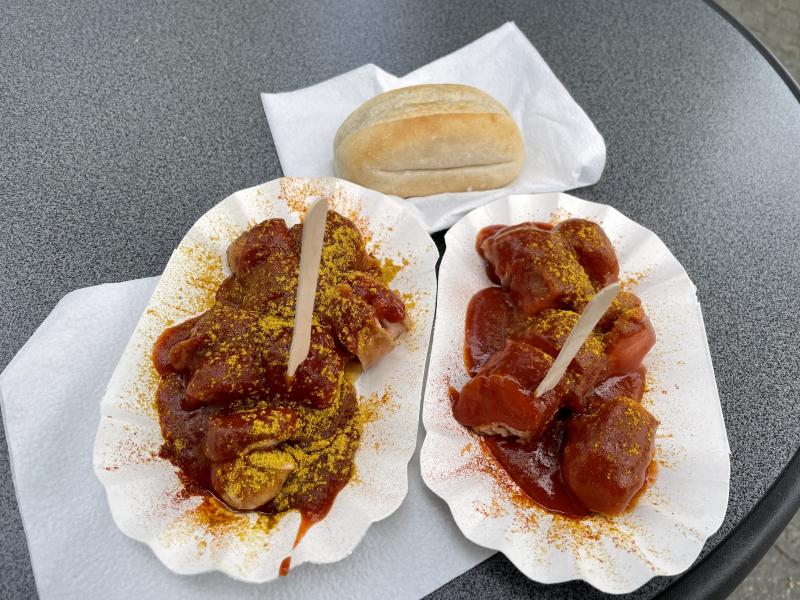 durch zufall kam ich an einer der letzten originalen berliner imbissbuden vorbei: also gab es zweierlei currywurst von "det is knorke" – einmal normal, einmal chili (noch besser!) und zur feier des tages auch das obligatorische brötchen, auf das ich sonst in der regel verzichte.