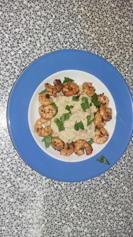 Und anschließend (die Idee stammt auch aus der aktuellen e&t) gebratene Garnelen auf Bohnencreme, dazu ebenfalls Ciabatta.