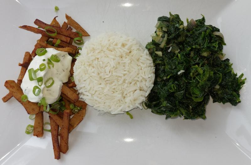 Seitangeschnetzeltes, Basmati, Spinat und Tzatziki, dazu Gurkensalat mit viel frischem Koriander