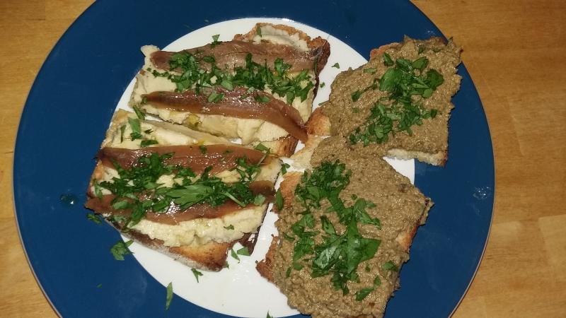 Crostini mit Bohnencreme, Sardellen und Petersilie.