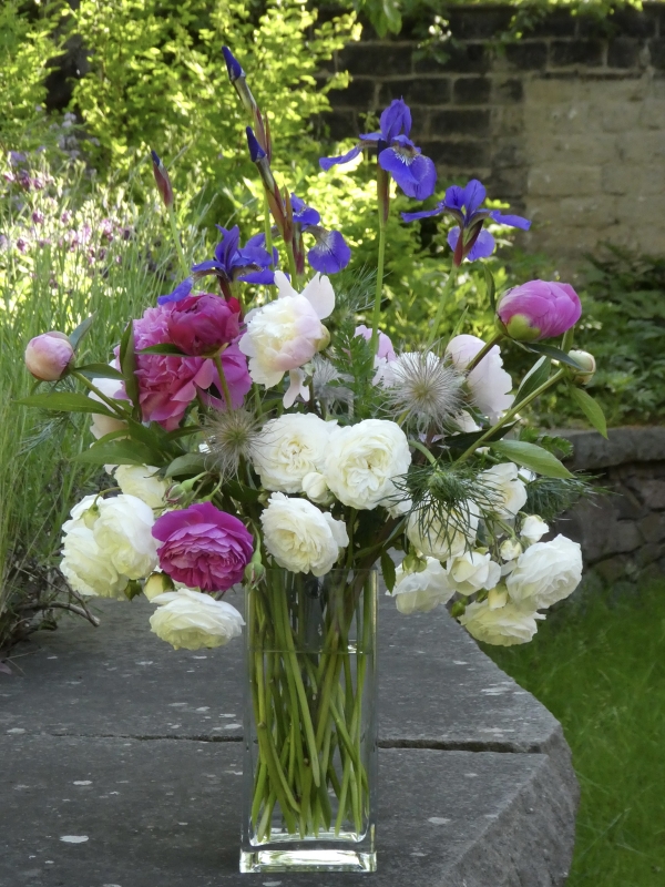 Die letzten Pfingstrosenblüten aus Verzweigungen. Dieses Jahr sind es nur wenige und die Blätter wegen des feuchten Frühjahrs großteils vergammelt, so dass die Blüten kurz geschnitten sind. Die Blütenstiele werden von zwei Kenzans (Plural???) gehalten.