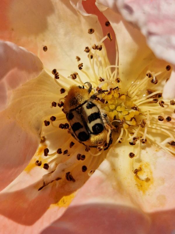 Dieser Pinselkäfer schlief in meiner Roseromantik, als ich die Blüte etwas mehr in die Sonne schieben wollte, wachte er auf und flog davon