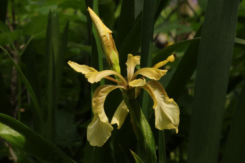 Verschiedene Sämlinge von Iris foetidissima fangen an zu blühen. Dieser in Hellblau.