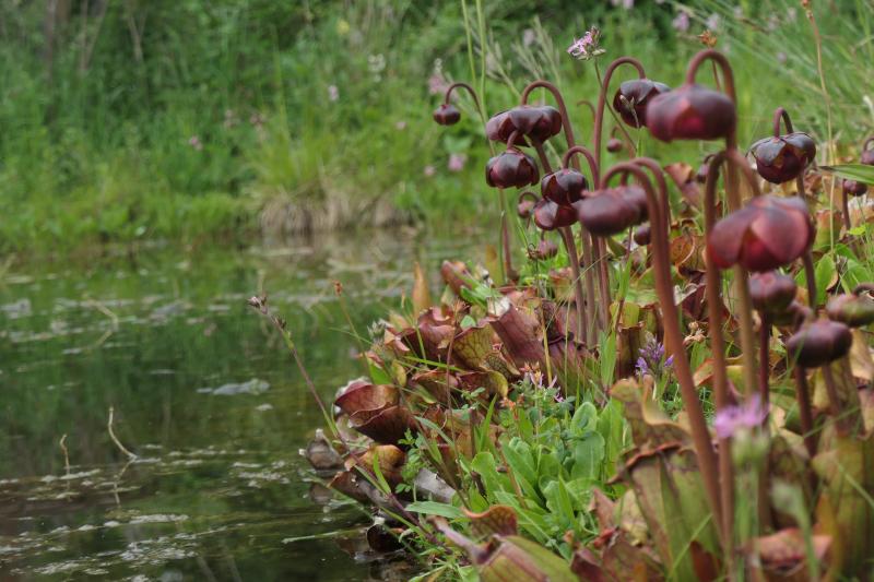 Fast wie Ufos am Teichrand: Sarracenia puprurea beginnt zu blühen: