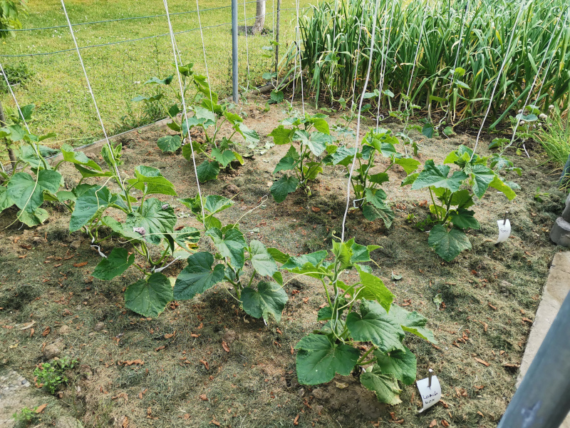 Dieses Jahr 10 Pflanzen gesetzt. Beim aufleiten die Seitentriebe und Gurken entfernt. Demnächst dürfen sie aber dranbleiben, so langsam werden sie etwas kräftiger. Dann gehts auch bald mit ernten los.