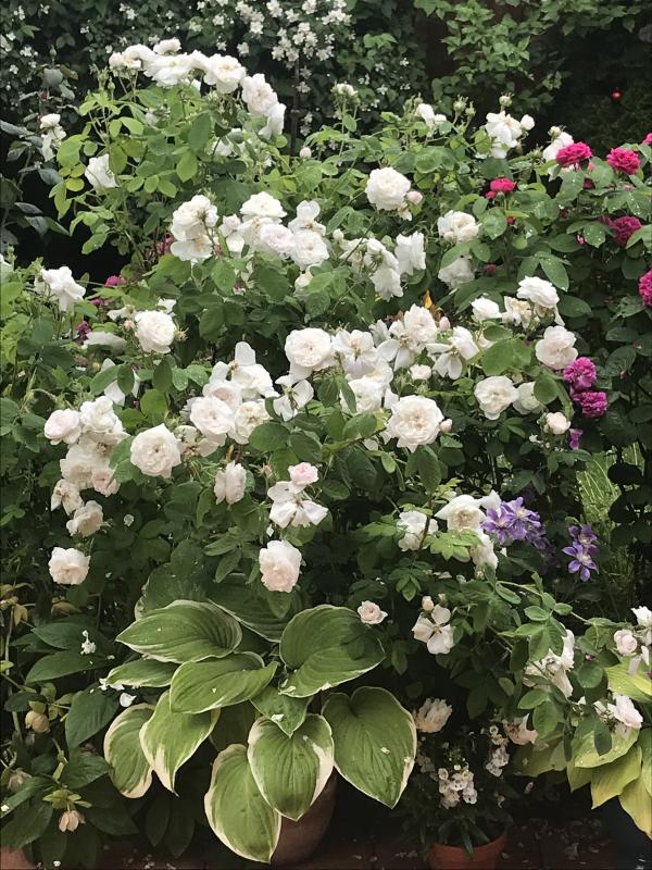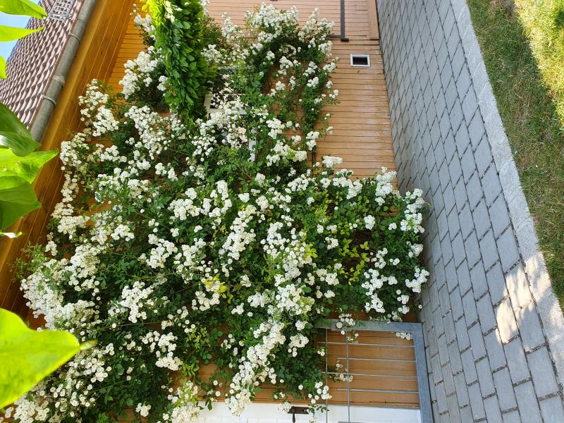 Ein Blick von oben auf die Rosenlandschaft vor dem Haus. Constance Spry bedankt sich gerade sehr für's Aufbinden. Ich habe sie zur Lieblingsrose erklärt. Eine von ...