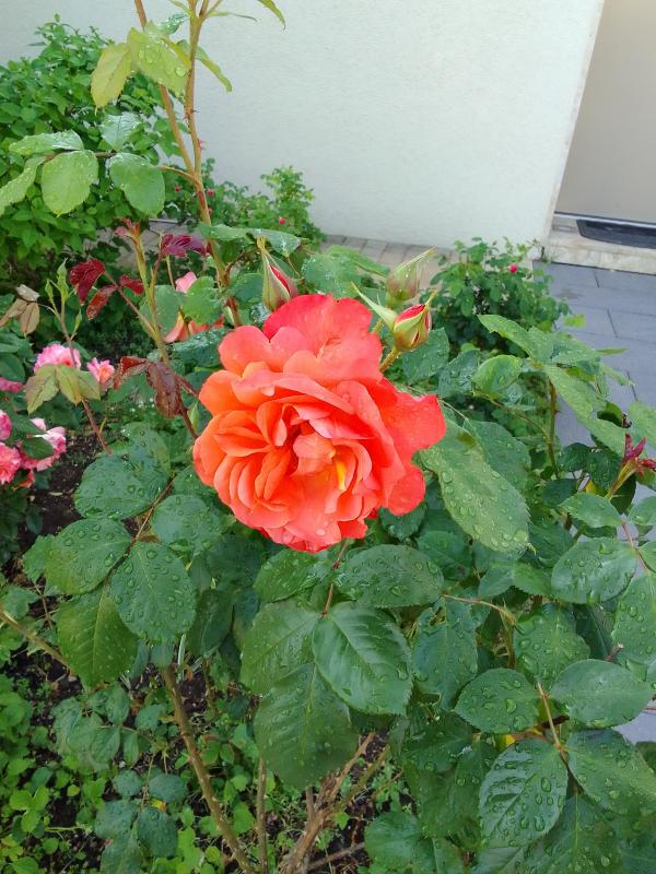 Lykkefund, Rosa de Resht, Rosa tomentella (optusifolia), Ghislaine de Feligonde, Orange Dawn, meine Unbekannte (ich habe tatsächlich innerhalb eines Jahres ihren Namen vergessen) am Rosenbogen und Paul Scarlett Climber (der locker eine Regenwasser-Sammeltonne versteckt), stehen in den Startlöchern. Wobei Lykkefund wohl als nächstes richtig aufblüht, zusammen mit Ghislaine.