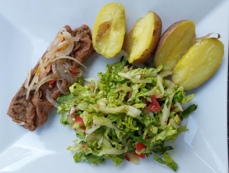 Gestern und vorgestern gab es hier Käse-Fleischküchle mit Kartoffel-Gurkensalat, zusätzlich gewürzt mit Schnittlauch und etwas Liebstöckel. Ich mach da immer gleich die doppelte Menge, weil so aufwändig.