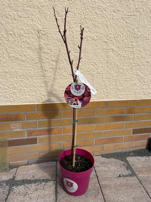 Heute habe ich den "Himbeerbaum" von Heinje im Gartencenter mitgenommen. Der Raspbeary Rubus idaeus x Harasap. Er soll bis 2m hoch werden und die Ernte ist von Juli bis September. Kleine 3 mm Stachel hat er auch und ist bis -24 grad angegeben.